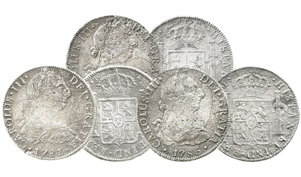 Lot of 3 Mexico City, Mexico, bust 8R of Charles III: 1780FF, 1781FF and 1786FM. KM-106.2. 71.8 grams total. Good toning and details despite light to moderate surface corrosion. Recovered from: Cazador, sunk in 1784 off New Orleans in the Gulf of Mexico