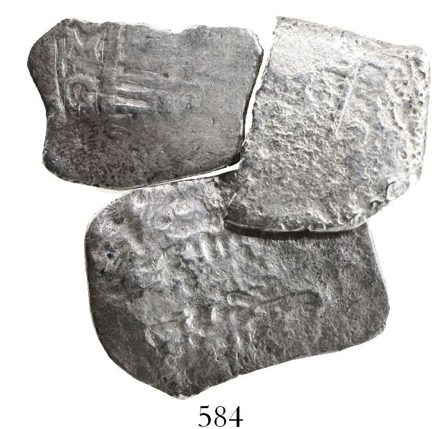 Lot of 3 Mexico City, Mexico, cob 8 reales, Charles II, one with assayer G visible. KM-46. 29.14 grams total. Corroded to the point of fragmentation, but recognizable and bold oMG on one. Recovered from: Joanna, sunk in 1682 off South Africa