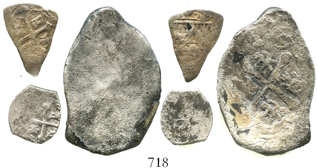 Lot of 3 Mexico City, Mexico, silver cobs of Philip V, assayer not visible: one 8R, one 1R and one 1/2R. 16.5 grams total. Motley assortment of denominations but all with decent crosses despite corrosion. With three Cobb Coin Co. (Fisher) certificates: #1017, #16443 and one generic. Recovered from: Spanish 1715 Fleet, sunk off the east coast of Florida