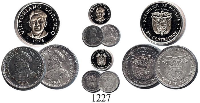 Lot of 3 Panama 2½ centésimos, 1904 (2) and 1976FM (copper-nickel), known as "Panama pills". KM-1 and 34.1. 1.2 grams each. Small but thick, "puck"-like coins nicknamed "Panama pills," the 2 earlier specimens in silver being toned AU and the modern coin Proof.