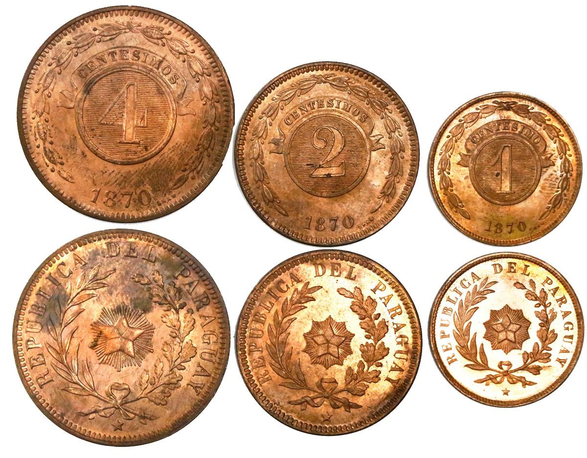 Lot of 3 Paraguay copper minors of 1870: 1, 2 and 4 centesimos (Shaw). KM-2, 3 and 4. 34.79 grams. All well-struck, choice UNC coins with mostly red luster, some areas of dark copper toning.