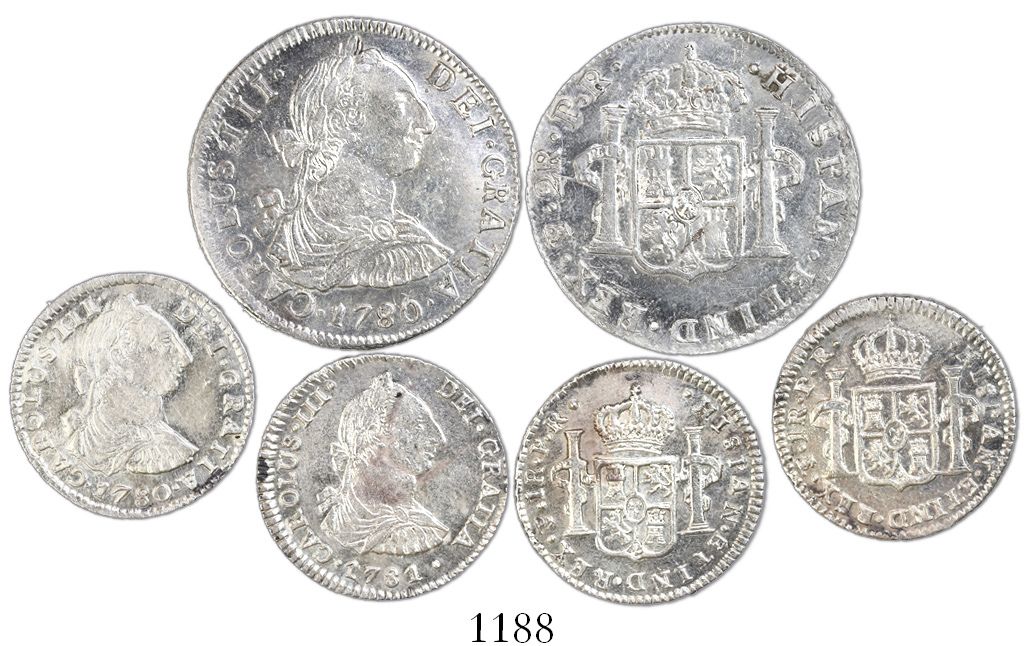 Lot of 3 Potosi, Bolivia, bust 2R and 1R, Charles III: 2R, 1780/79PR; 1R, 1780PR; and 1R, 1781PR. 13.43 grams total. All lustrous UNC, starting to tone.