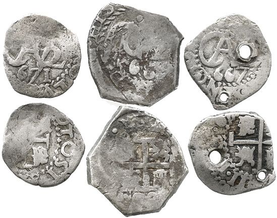 Lot of 3 Potosi, Bolivia, cob 1/2R of Charles II: 1667, 1671 and 1682. KM-22. 5.0 grams total. Generally clear dates (3 digits below monogram), decent crosses and/or monogram, Fine+ on average, the 1667 with 2 old holes, the 1671 with desirable pedigrees. The 1671 is pedigreed to the Sellschopp collection and to the Paul Karon collection (Ponterio, March 1990), lot #1092.