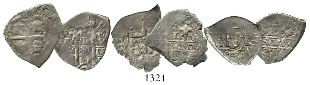 Lot of 3 Potosi, Bolivia, cob 1R of Charles II, assayer V, various dates (1680, 1681 and 1682). 9.2 grams total. Nice VF-XF, interesting shapes, clear details.