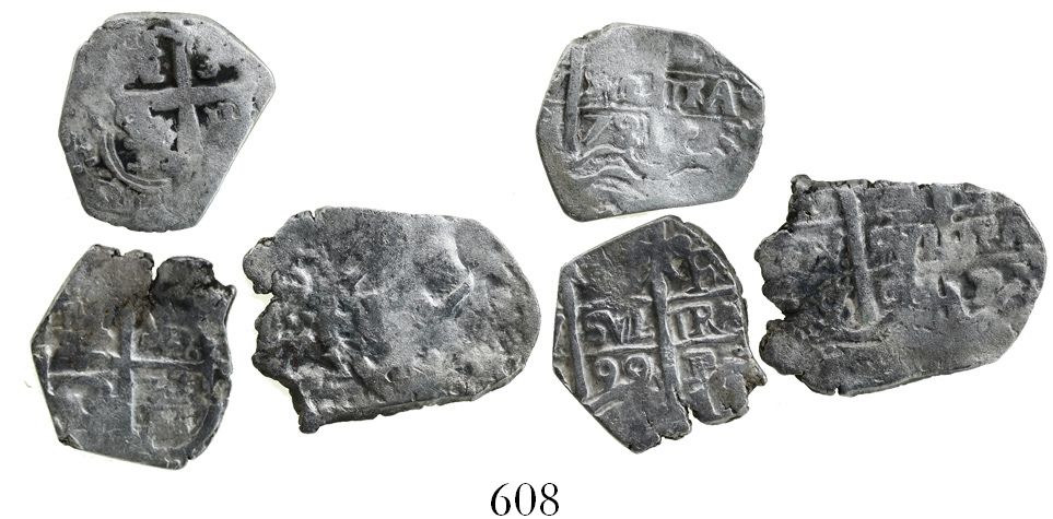 Lot of 3 Potosi, Bolivia, cob 1R, various assayers (1678E, 1699F and 1704Y), desirable provenance. 6.91 grams total. Variety of shapes and sizes (the 1678E clipped in its time), minimal corrosion and decent details. Recovered from: Feversham, sunk in 1711 off Nova Scotia, Canada
