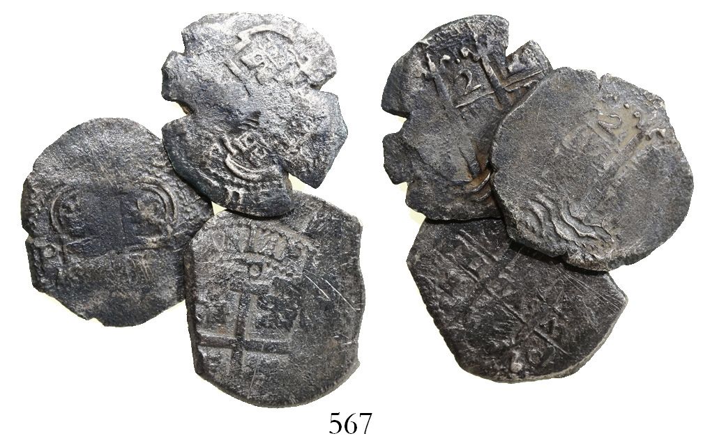 Lot of 3 Potosi, Bolivia, cob 2 reales, Charles II, assayers and dates not visible. KM-24. 17.00 grams total. Darkly toned (uncleaned) and not overly corroded but fraught with flatness, still decent crosses and/or pillars. Recovered from: Unidentified ca.-1671 wreck in Seville harbor, Spain