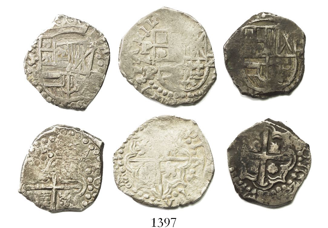 Lot of 3 Potosi, Bolivia, cob 2R of Philip IV, assayers T and P where visible. 20.08 grams total. F-VF with partial dates, quadrants transposed, error DINDIA(RVM) and other interesting features, no problems, wide range of toning. The P-dot-P specimen is pedigreed to the Karon collection (Ponterio, March 1990), lot #506.