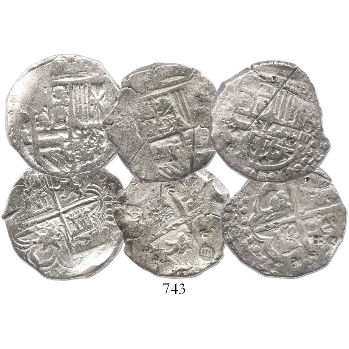 Lot of 3 Potosi, Bolivia, cob 4 reales, Philip III and IV, one with assayer R visible, with small chopmarks and test-cuts as from circulation in the Orient. 39.2 grams total. Silvery AVF on average, with mostly full shields and crosses, interesting cuts and chops, which are somewhat rare on smaller denominations.