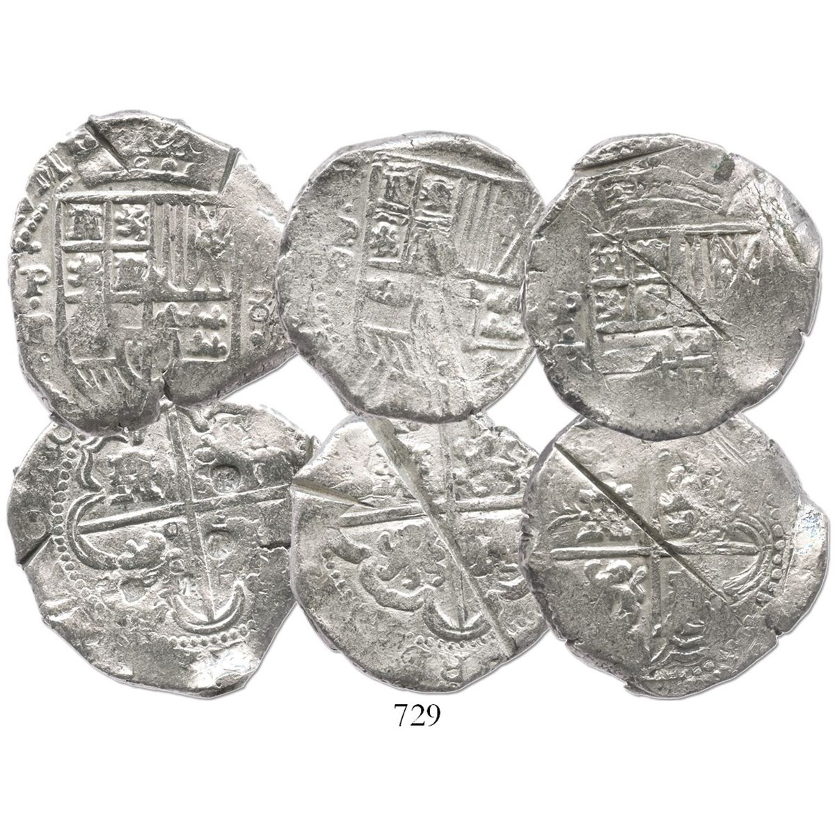 Lot of 3 Potosi, Bolivia, cob 8 reales, Philip IV, assayers T, TR and FR, with small chopmarks and test-cuts as from circulation in the Orient. KM-19a. 80.7 grams total. Clear assayers, good full shields and crosses, interesting chops and cuts, all silvery AVF.