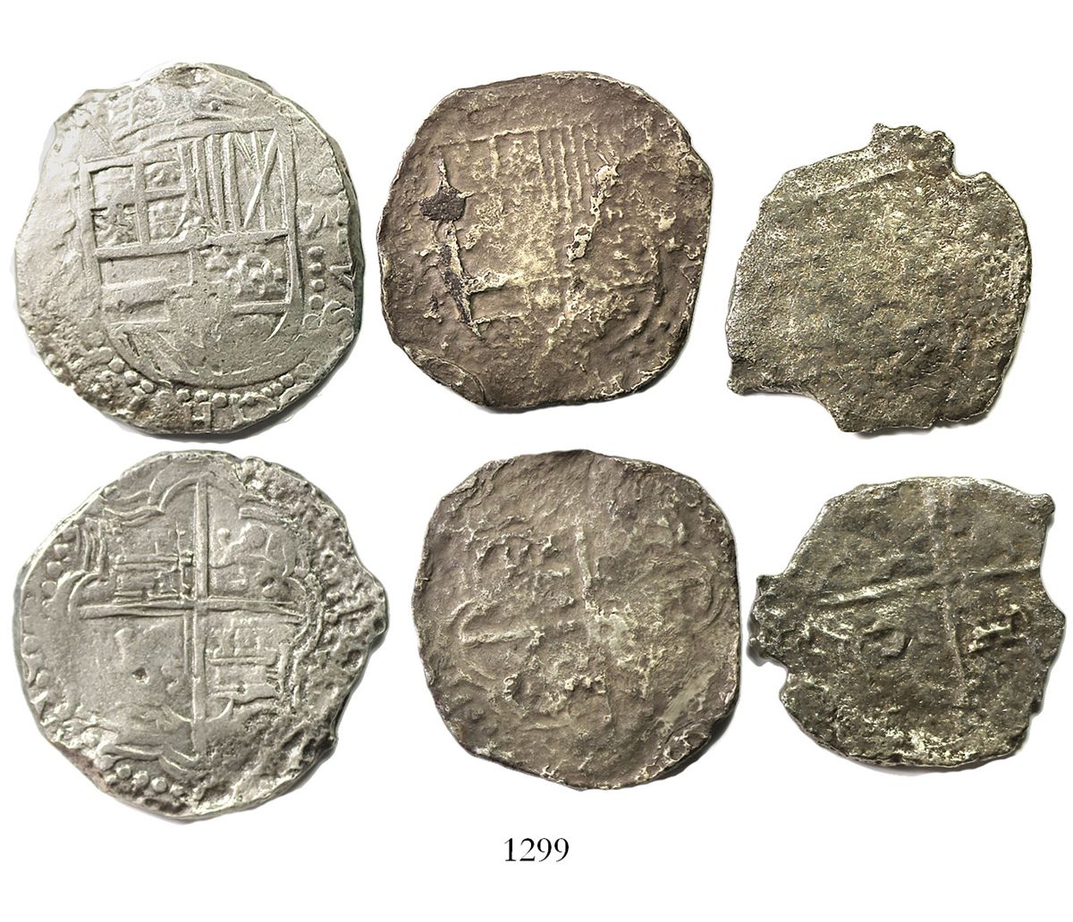 Lot of 3 Potosi, Bolivia, shield-type cob 8R, Philip III, assayers not visible, from various wrecks,
