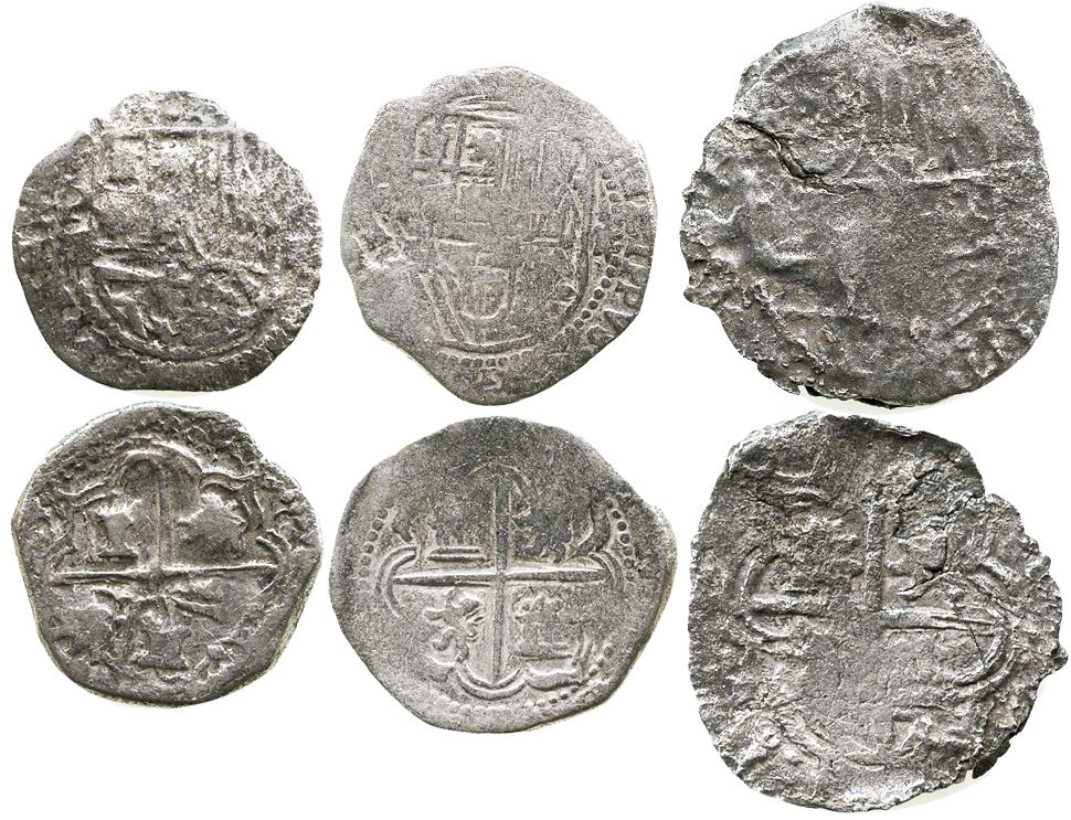 Lot of 3 Potosi, Bolivia, smaller cobs of Philip III (assayers not visible): one 4R no Grade (Grade-3 quality) and two 2R Grade 2. 22.2 grams total. Some corrosion and/or wear but generally clear shields and crosses. With Fisher certificates #120020, 176614 and 221720. Recovered from: Atocha, sunk in 1622 west of Key West, Florida