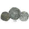 Lot of 3 Potosi small silver cobs of Philip II-III (one 2R and two 1R). 12.2 grams total. The 2R is Philip II 1st-period B (flat lions) and the 1R are Philip II RL and Philip III curved-leg R, all with nice detail, toned F-VF, the RL coin with hole at edge.