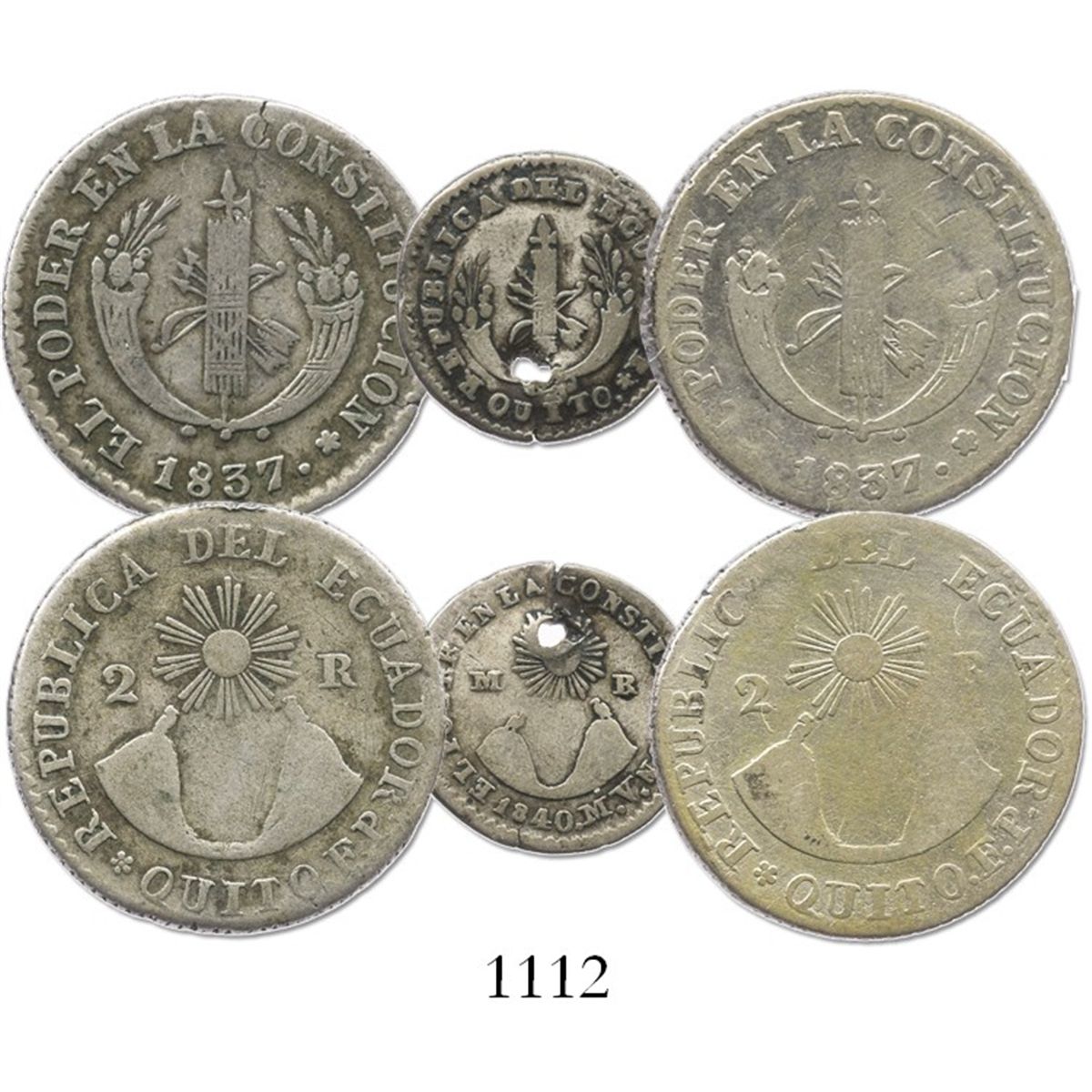 Lot of 3 Quito, Ecuador, minors: 2R 1837FP (2) and 1/2R 1840MV (holed). 14.4 grams. F-VF, mostly good toning, the 1/2R crudely holed.