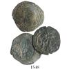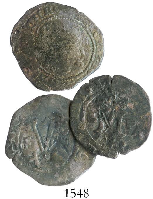 Lot of 3 Santo Domingo, Dominican Republic, copper 4 maravedis, Charles-Joanna, assayer F, with key (2M 1577) and/or anchor (Jamaica 1611-16) countermarks. S-SD1. 3.2, 3.2 and 3.1 grams. Typically dark and worn but all with mintmark S-P and assayer F visible and countermarks that make them more valuable: Key alone, Gothic legends; anchor alone, broad flan; and key and two anchors (rare), small and corroded flan.