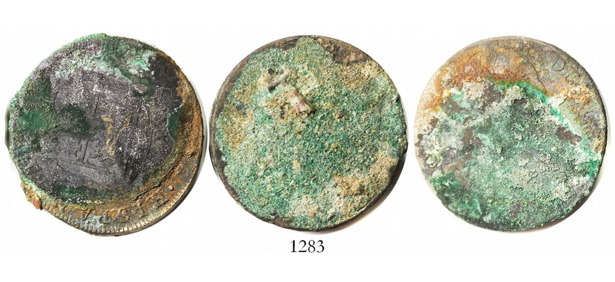 Lot of 3 Spanish colonial bust 8R (probably Lima, Peru, 1800IJ), uncleaned as found. 82.26 grams total. Heavily encrusted with lots of green and white, solid coins but no details visible through the crust. Recovered from: Leocadia, sunk in 1800 off Punta Santa Elena, Ecuador