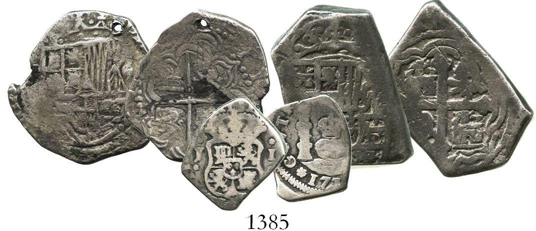 Lot of 3 Spanish colonial cob minors: Mexico 4R Philip V assayer not visible; Potosi 2R Philip III assayer Q; and Guatemala 1R 173(?)J. 22.9 grams total. Toned F-VF, nice shields, the 2R holed. The Potosi 2R comes with an original Henry Christensen envelope.