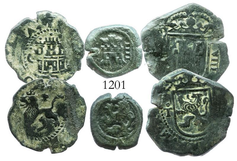 Lot of 3 Spanish copper cobs of Philip II and III, various mints. 13.4 grams total. Three different mints and denominations (Toledo 8 maravedis, Cuenca 2 cuartos and Madrid 4 maravedis), all with nice details with dark surfaces (some highlighted with tan sediment), F-VF or better, great lot for study.