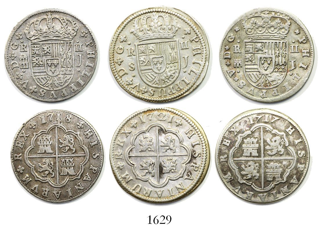 Lot of 3 Spanish milled 2R "pistareens": Segovia, 1717J and 1718J; Seville, 1721J. 15.91 grams total. Problem-free VF-XF, the 1718 with choice toning, popular coins.