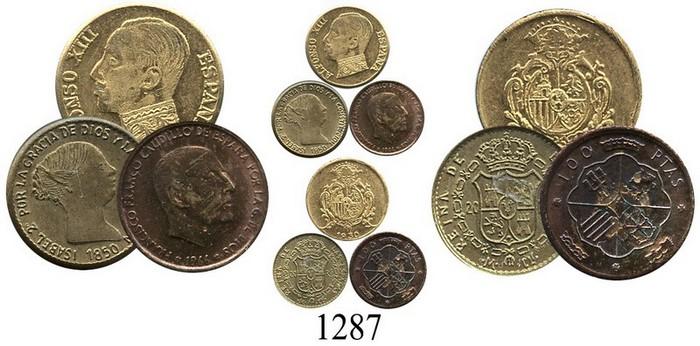 Lot of 3 Spanish miniature replicas: 1850 Isabel II 20 reales in brass, 1930 Alfonso XIII fantasy in gold, and 1966 100 pesetas Franco in copper. 0.3 to 0.6 grams each. Fantasy lot of miniaturized coins, all UNC, a nice mix of colors.