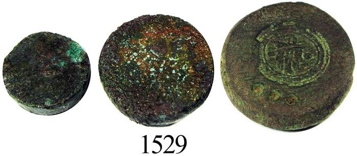 Lot of 3 brass coin weights, 2 with seals on top. 12.9, 8.5 and 4.4 grams, ½" to 7/8" in diameter each. Three small disks of brass in more or less incremental weights, the two larger ones with stamped seals on top, the middle one corroded but the largest with clear •castle• above the letter C (probably rare and significant). Found in a Spanish colonial area in the southern Caribbean, ca. 1590.