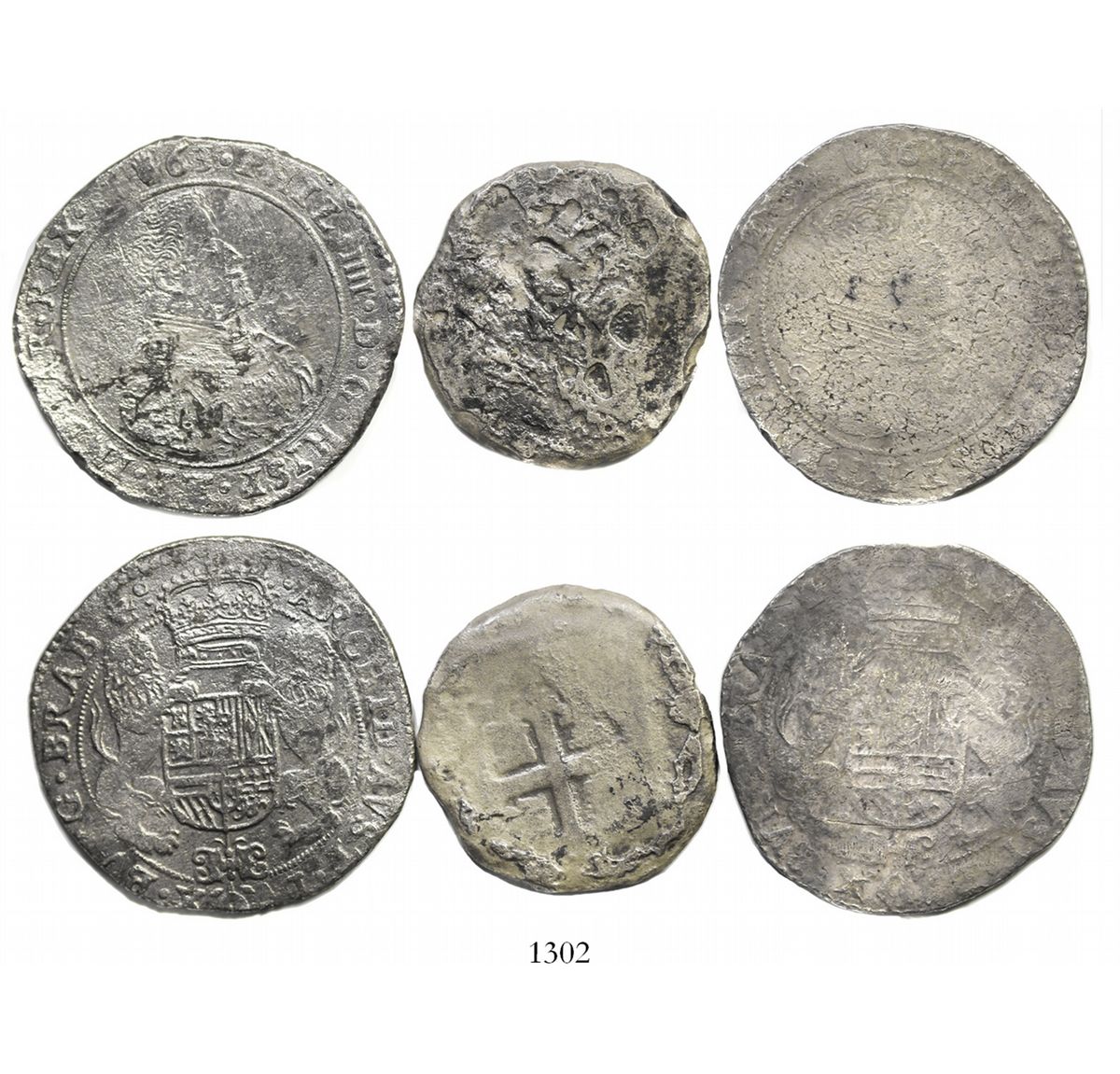 Lot of 3 crown-size coins from Dutch shipwrecks: 1656 portrait ducatoon from the Merestein (1702); Mexican cob 8R Philip V from the Akerendam (1725); and 1663 portrait ducatoon from the Hollandia (1743). 82.35 grams total. All corroded but with clear details and light toning, well-known wrecks. With certificates, the Hollandia coin pedigreed to our Auction #7, with original lot-tag #636. Recovered from: Miscellaneous wrecks