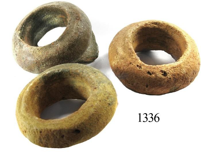Lot of 3 earthenware olive jar necks. Each about 9 oz and 4" in diameter. Three complete necks, very useful for displays and far less common than the lateral shards, various hues of orange and brown. Recovered from: "San Francisco wreck," sunk ca. 1649 off the Cape Verde Islands. With Arqueonautas certificate #AGO-063/99/15608.