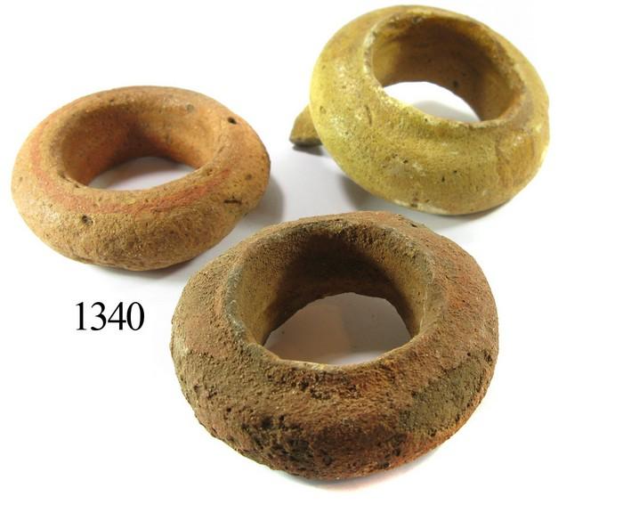 Lot of 3 earthenware olive jar necks. Each about 9 oz and 4" in diameter. Three complete necks, very useful for displays and far less common than the lateral shards, various hues of orange and brown. Recovered from: "San Francisco wreck," sunk ca. 1649 off the Cape Verde Islands. With Arqueonautas certificate #AGO-063/99/15608.