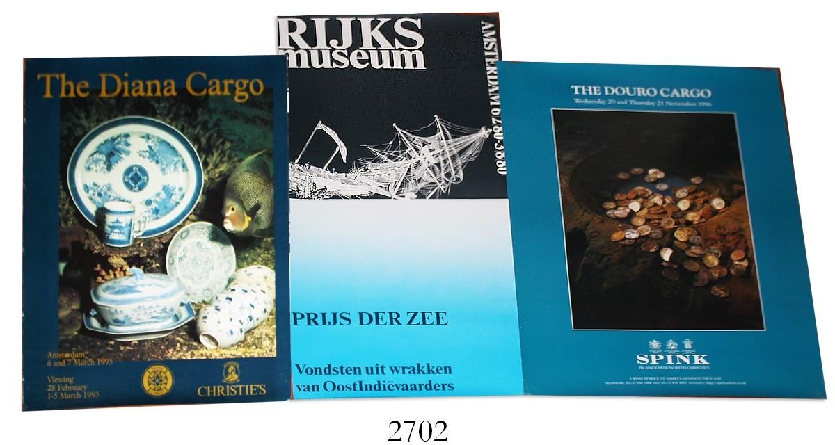 Lot of 3 shipwreck posters: Rijksmuseum Amsterdam exhibition (Vliegenthart, February 6 to August 3, 1980); Christie's Amsterdam auction (Diana Cargo, March 6-7, 1995); and Spink London (Douro Cargo, November 20-21, 1996). 31-1/2" x 15-1/2", 27" x 21", 27-1/2" x 19-3/4". All in excellent condition and full color, advertising various exhibits and auctions.