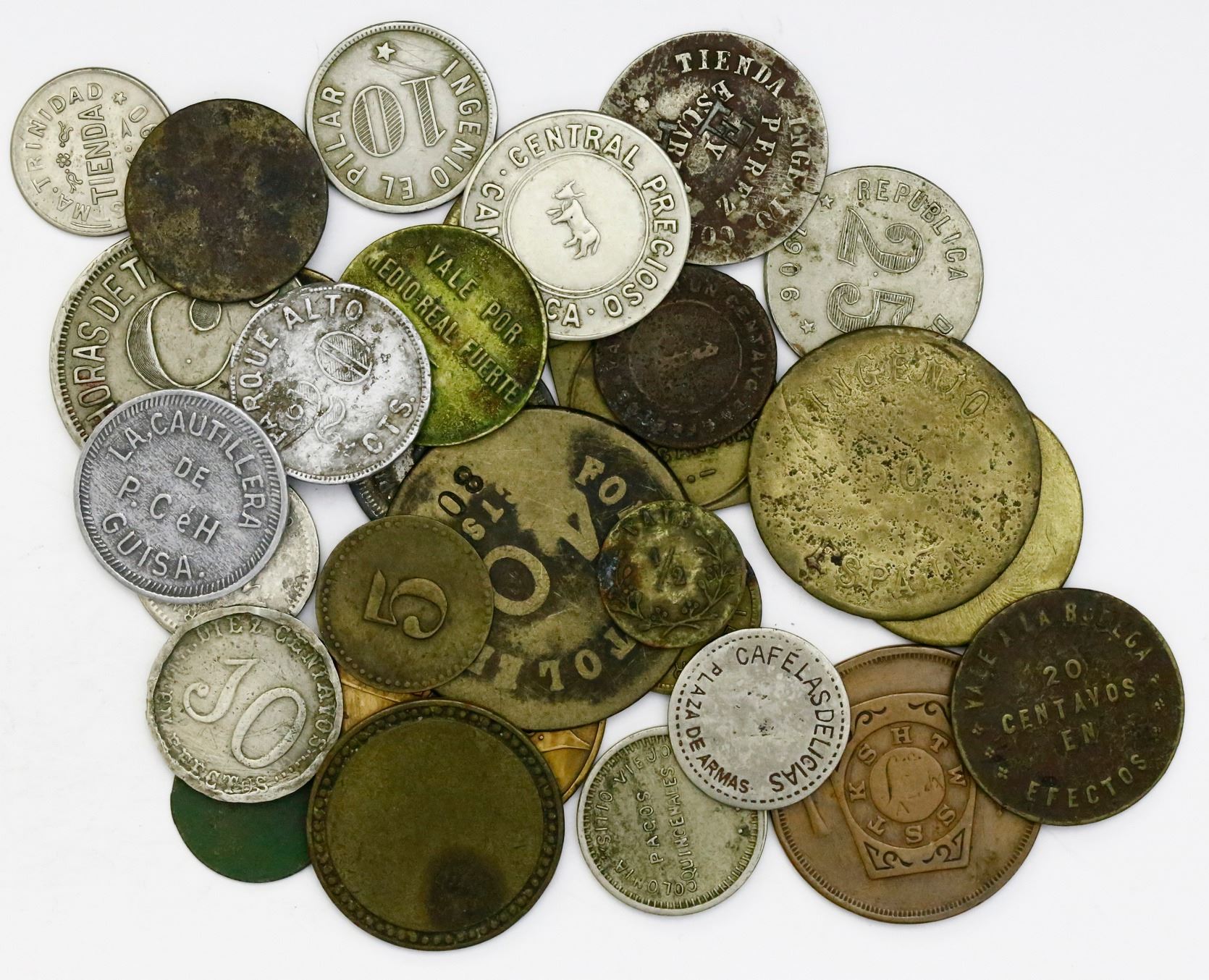 Lot of 30 Cuban tokens, various metals, mostly 1900s.