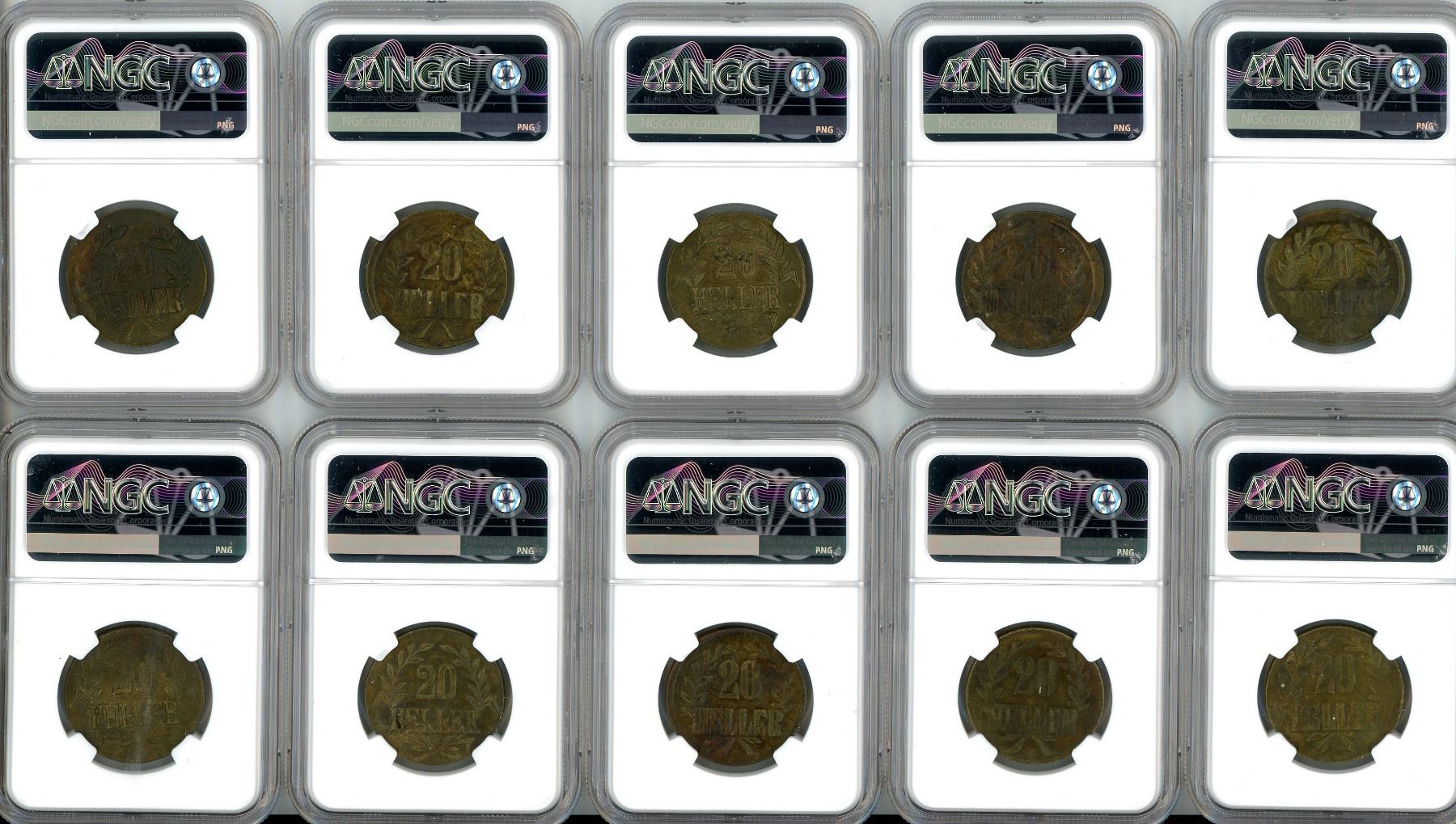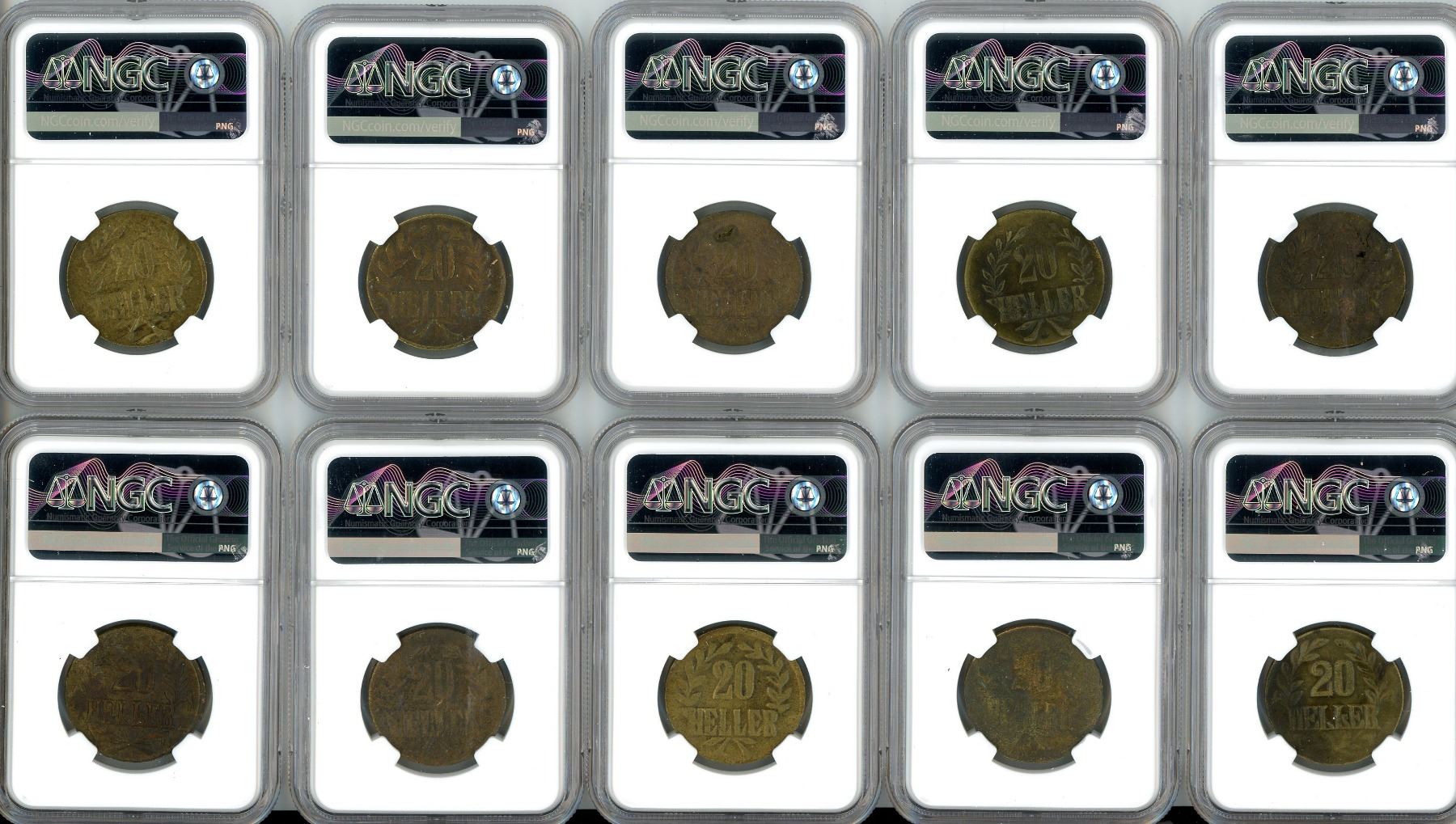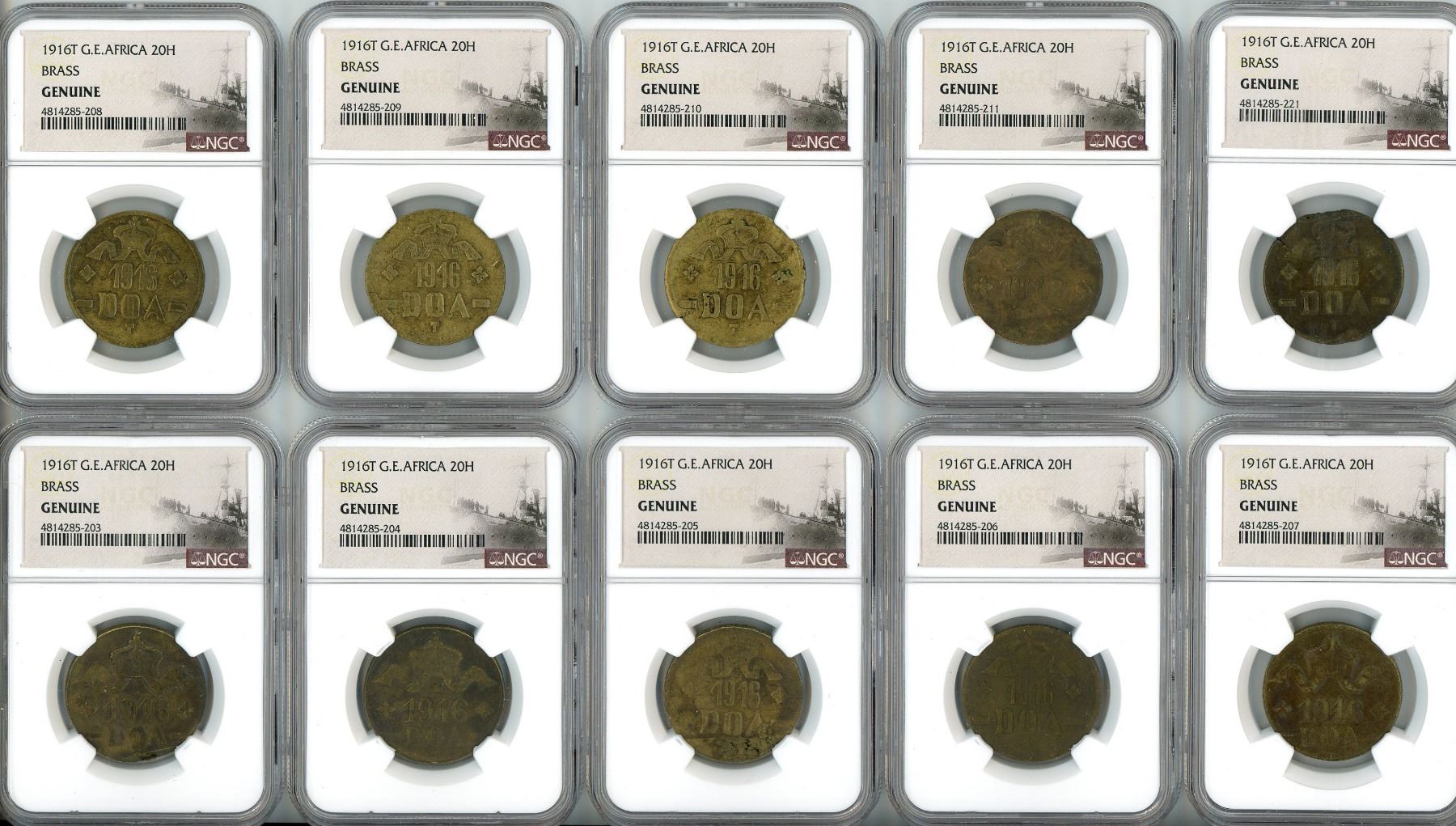 Lot of 30 German East Africa brass 20 heller, 1916-T, all NGC genuine. KM-15a. The SMS Konigsberg (laid down on January 12, 1905) was a German light cruiser that served in the High Seas Fleet prior to World War I. After the outbreak of hostilities, the ship was stationed in German East Africa where it sank the British cruiser HMS Pegasus. While conducting repairs in the supposed safety of the Rufiji River, the Konigsberg was blockaded and then attacked by two British monitors. She was damaged enough that the crew scuttled the ship on July 11, 1915 after salvaging the main guns. Further salvage removed machinery used to set up a provisional mint in 1916 at Tabora. There, 20 hellers were struck using brass from spent shell casings and copper from salvaged ship's pipes. Minting continued until the capture of Tabora by the Belgian army. Typical crude appearance yet complete, all with some circulation and toning, a number of different varieties here. Recovered from: SMS Konigsberg, sunk in 1915 in the Rufiji River, Tanzania, Africa