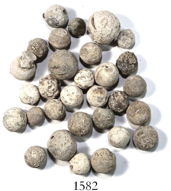 Lot of 30 lead musketballs, some with carvings or marks and holes, Spanish colonial (1500s-1600s). 48.5 grams total, each about 1/2" to 3/4" in diameter. Typical lead balls with whitish residue. Found at a Spanish colonial settlement in the southern Caribbean.
