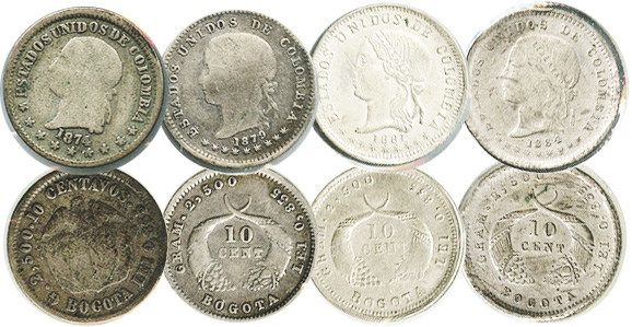 Lot of 4 Bogota, Colombia, 10 centavos: 1874, 1879, 1881 and 1884.