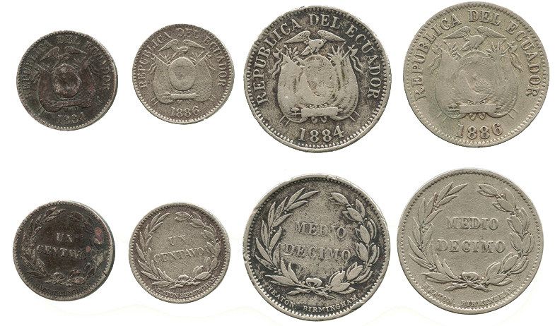 Lot of 4 Ecuador copper-nickel minors: 1/2 decimo, 1884 and 1886; 1 centavo, 1884 and 1886. 19.2 grams total. VF on average, the 1c 1884 with minor surface corrosion, all more or less toned.