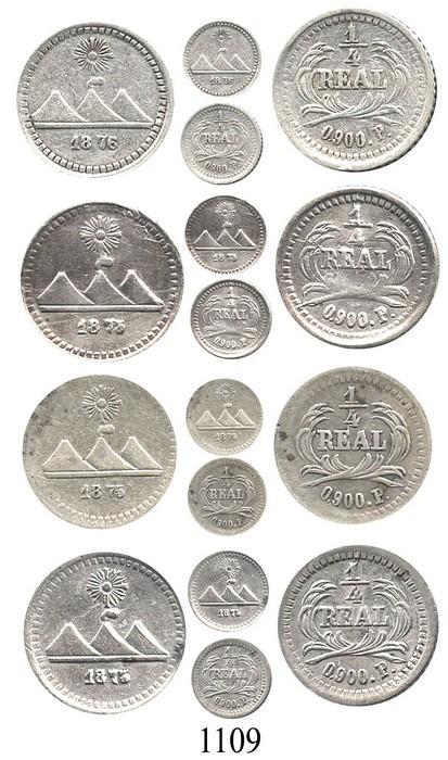 Lot of 4 Guatemala ¼ reales, 1873/2P (2), 1875/3P, and 1876P. KM-146. 0.6 to 0.8 gram each. All XF, 2 of them beginning to tone.