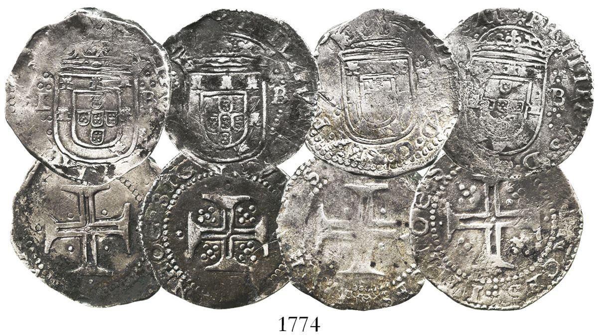 Lot of 4 Lisbon, Portugal, tostaos (100 reis), Phillip II or III (late 1500s to early 1600s), with L to left and B to right. 30.0 grams total. Toned F-VF with full shields and crosses.