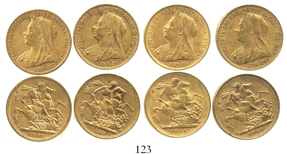 Lot of 4 Melbourne, Australia, sovereigns, Victoria (veiled head), various dates: 1898, 1899 and 1900 (2). KM-13; Sp-3875. 32.0 grams total. XF or thereabouts, no problems.