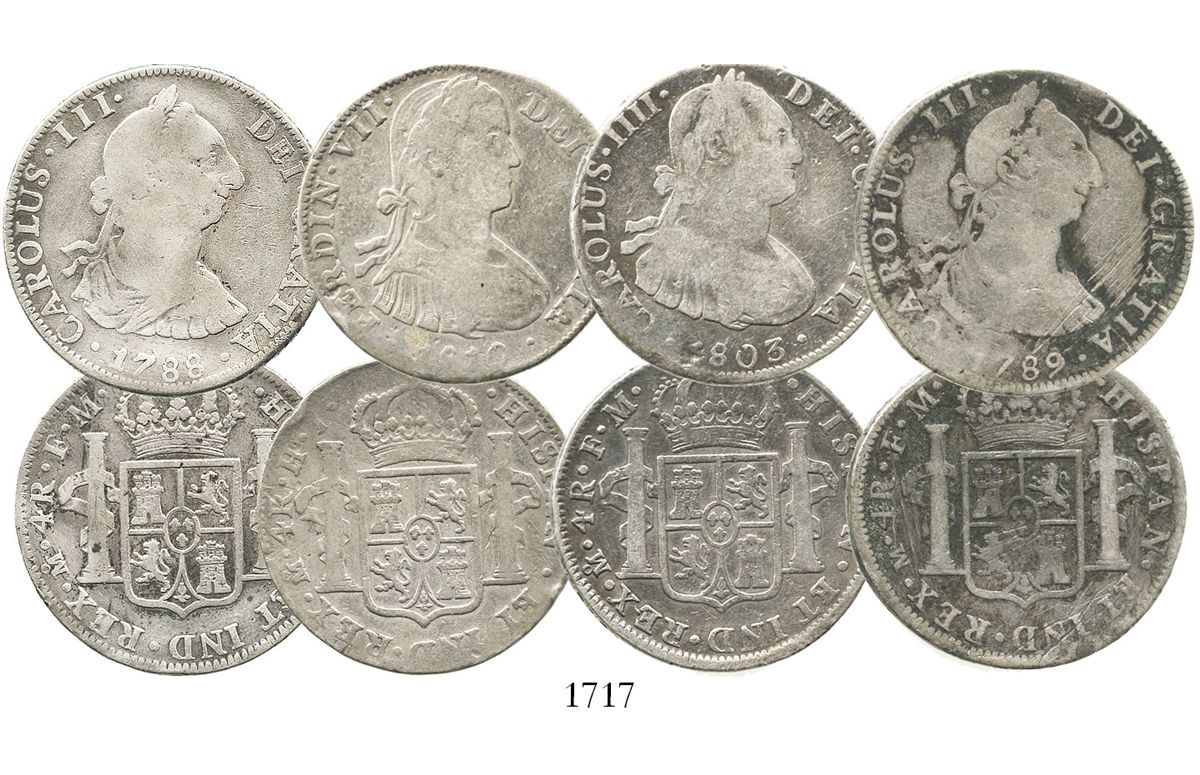 Lot of 4 Mexico City, Mexico, bust 4 reales of Charles III, Charles IV and Ferdinand VII: 1788FM, 1789FM, 1803FM and 1810HJ ("armored" bust). 52.4 grams total. Fine on average, mostly nicely toned, no big problems.