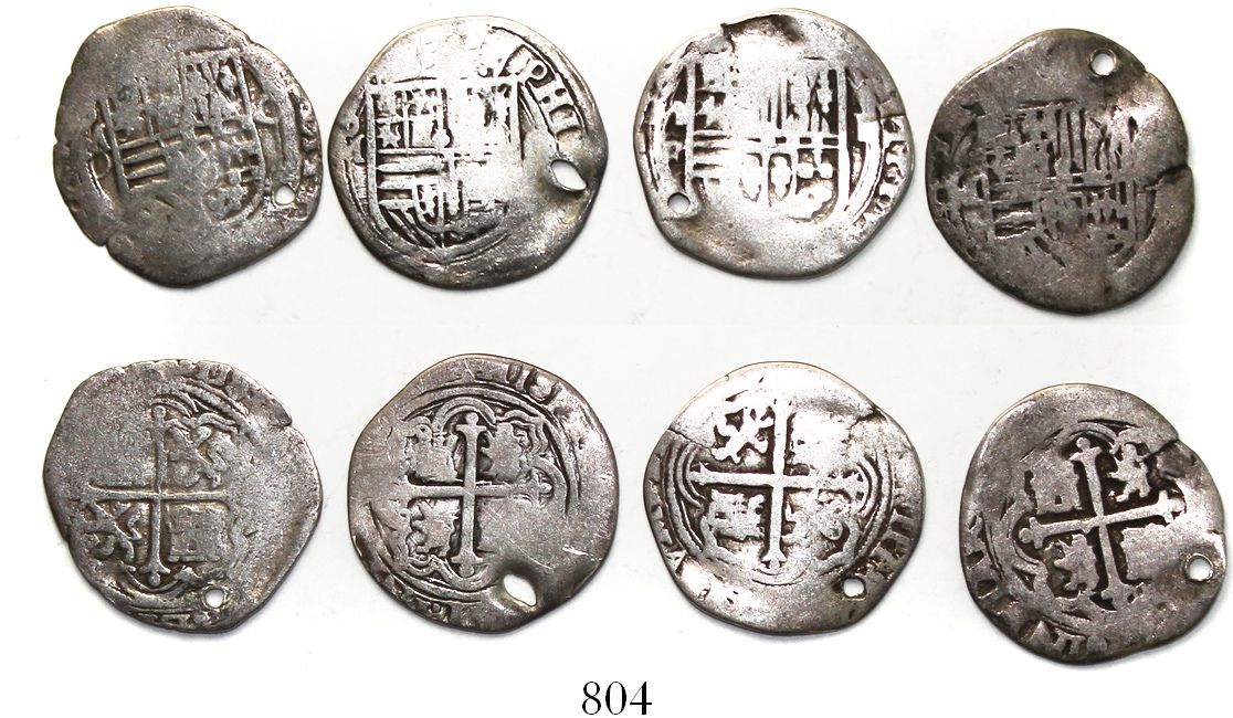 Lot of 4 Mexico City, Mexico, cob 1R, Philip II, assayers O and F. KM-26. 11.50 grams total. Good full shields and crosses and no worse than VG but all with holes near edge, decent toning.