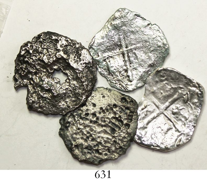 Lot of 4 Mexico City, Mexico, cob 4 reales, Philip III(?), assayers not visible, ex-Frank Sedwick. 24.70 grams total. Early coins for 1715 Fleet (possibly "Green Cabin Wreck" coins of ca. 1618 that were confused for Fleet as found in the same area), and quite thin and corroded overall, but the original bag should be of interest. With original plastic bag from Frank Sedwick that says in his handwriting: "as found on the beach, 1715 Fleet, east coast of Florida." Recovered from: Spanish 1715 Fleet, east coast of Florida