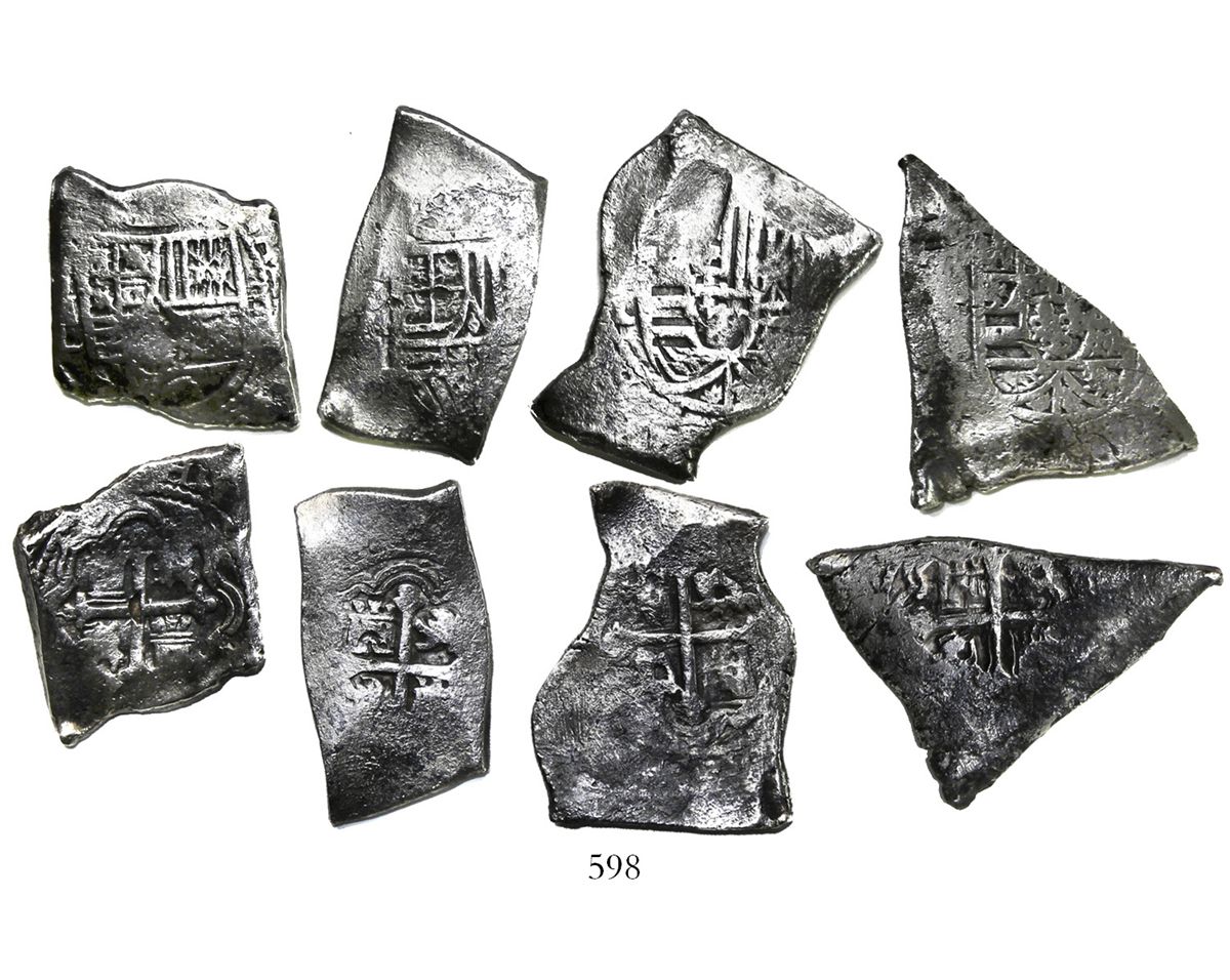 Lot of 4 Mexico City, Mexico, cob 8 reales, Charles II and Philip V, assayer L (where visible), ex-Sotheby's (1970) with original lot-tag and catalog. 105.35 grams total. Very solid coins in very interesting shapes, also well detailed for the period, nicely toned, and with a highly desirable classic shipwreck pedigree, quite likely to see spirited bidding. Pedigreed to the Sotheby's H.M.S. Association auction of January 1970, with original catalog and lot-tag #152. Recovered from: Association, sunk in 1707 off the Scilly Isles, southwest of England