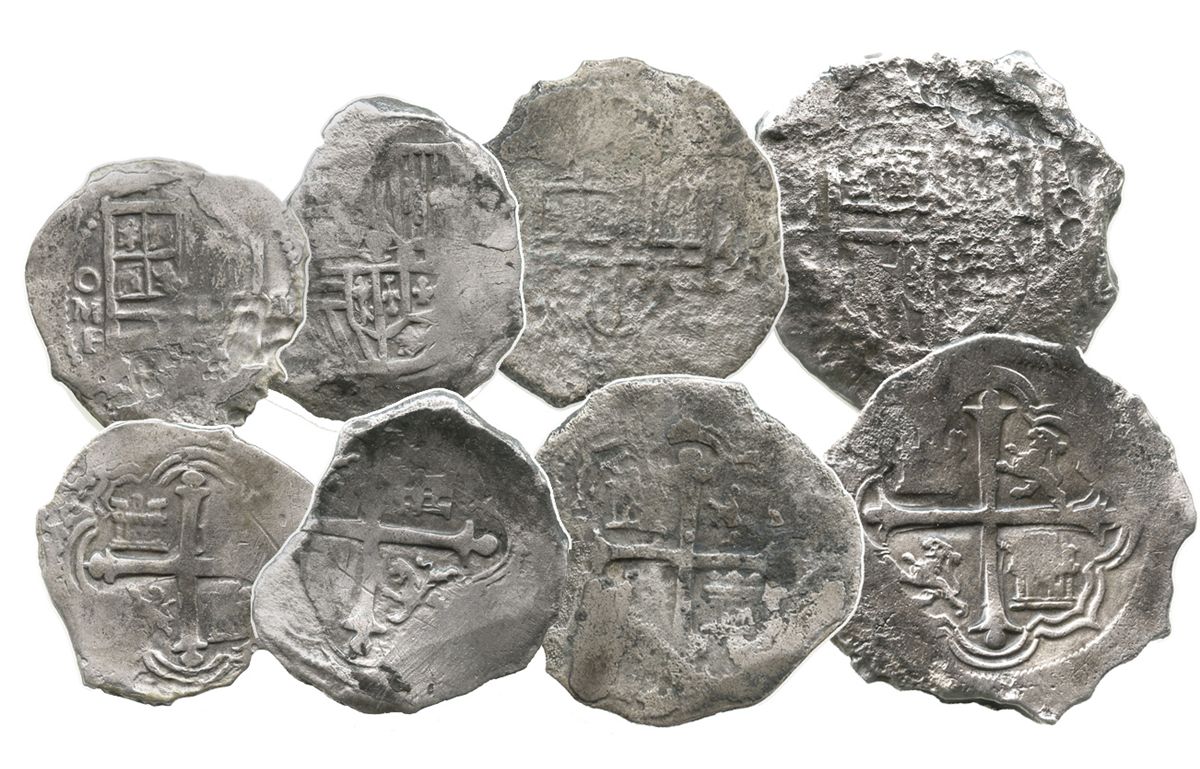 Lot of 4 Mexico City, Mexico, cobs (one 8R, two 4R and one 2R), Philip III, assayers F or not visible, Grades 1 and 3, certificates missing. 46.9 grams total. The 8R with superb full cross but corroded shield and edges, the other coins with some edge-corrosion but mostly decent interiors, lightly toned, pretty decent group overall for this wreck. With Fisher tags #1532, 5882, 7228 and 8159. Recovered from: Santa Margarita, sunk in 1622 west of Key West, Florida