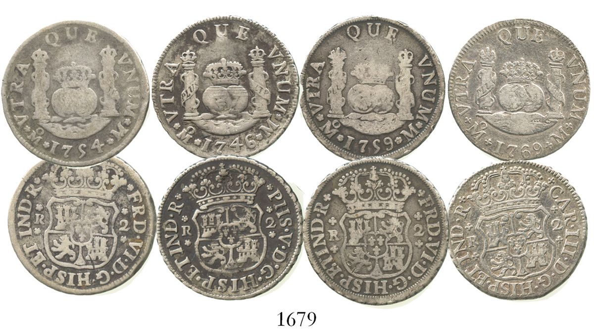 Lot of 4 Mexico City, Mexico, pillar 2 reales of Philip V, Ferdinand VI and Charles III: 1746M, 1754M, 1759M and 1769M. 25.7 grams total. AVF on average, mostly nicely toned, no big problems.