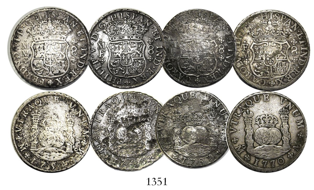 Lot of 4 Mexico City, Mexico, pillar 8 reales, Philip V through Charles III, various dates (1740MF, 1754MM, 1767MF and 1770FM). 103.73 grams total. VF details with decent toning, all but one salvaged.