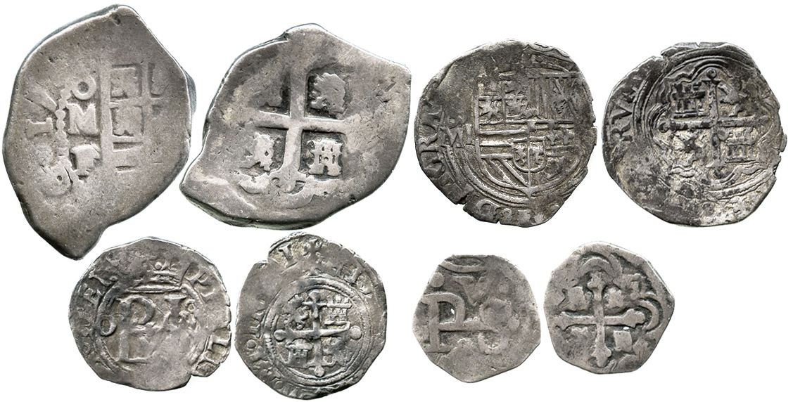 Lot of 4 Mexico City, Mexico, small silver cobs: 4R 17(30-33)F; 1R Philip II assayer not visible; 1/2R Philip II assayer O; and 1/2R Philip IV assayer not visible. 19.2 grams total. Mixed bag of periods and denominations but all more or less Fine and richly old-toned (from an old collection), all with good full crosses.