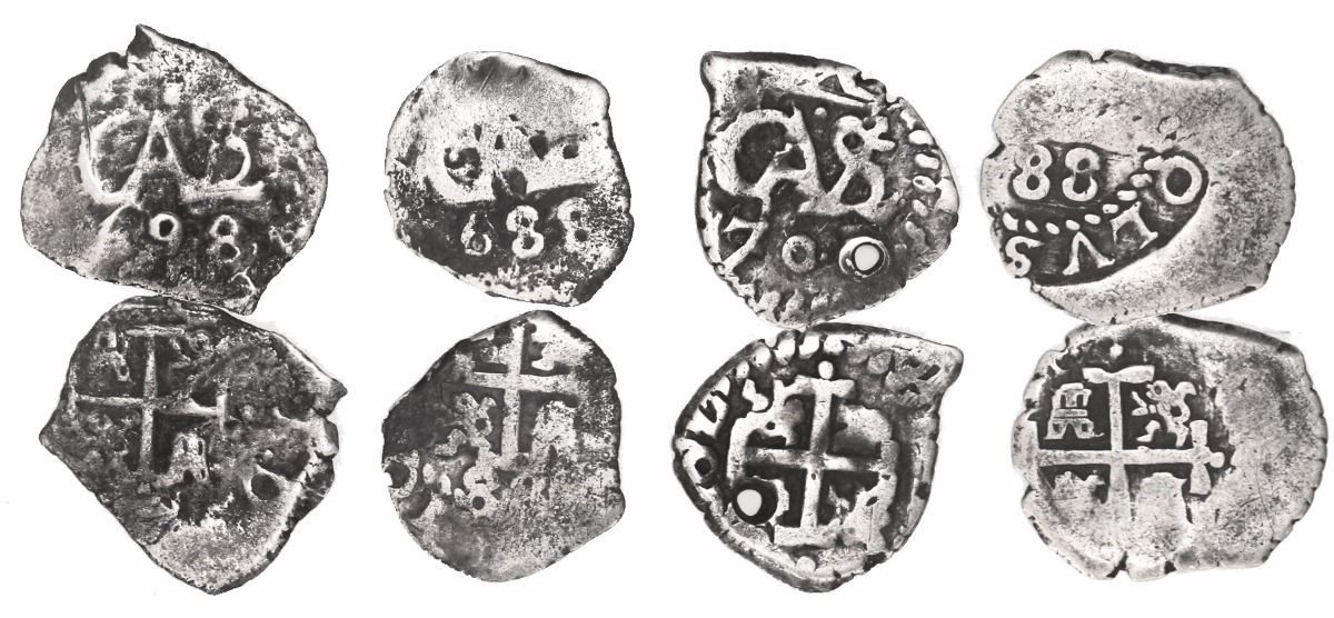 Lot of 4 Potosi, Bolivia, cob 1/2R: 1688 (2), 1698 and 1700. 6.33 grams total. Bold dates on all (one of the 1688s with two dates), also decent crosses and monograms, the 1700 holed, toned AVF overall.