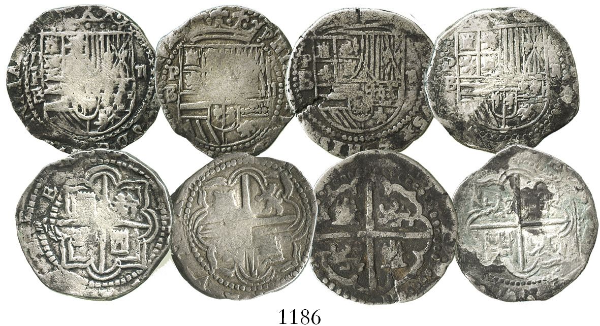 Lot of 4 Potosi, Bolivia, cob 2 reales, Philip II, assayer B (various periods). KM-3.2. 26.4 grams total. Generally good full shields and crosses, F-VF, mostly nicely toned.