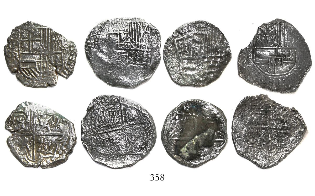 Lot of 4 Potosi, Bolivia, cob 4 reales, Philip III, various assayers (where visible), all Grade 2. KM-9. 43.60 grams total. Light to moderate corrosion, generally good crosses and shields. With Fisher certificates #154651, 157650, 217956 and 221386. Recovered from: Atocha, sunk in 1622 west of Key West, Florida