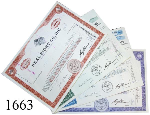 Lot of 4 Real Eight Co. stock certificates (one of each color). Each 8¼" x 12". Printed by the Columbian Banknote Company with backgrounds in four different colors (red, green, blue and purple), these certificates were for various amounts (from 10 to 1000, in this case) of shares of stock in the Real Eight Company (famous for its salvage of the 1715 Fleet off the east coast of Florida), each one dated from 1974-1979 and famously featuring an actual full-date 1715 Mexican 8 reales at the top. Excellent condition.