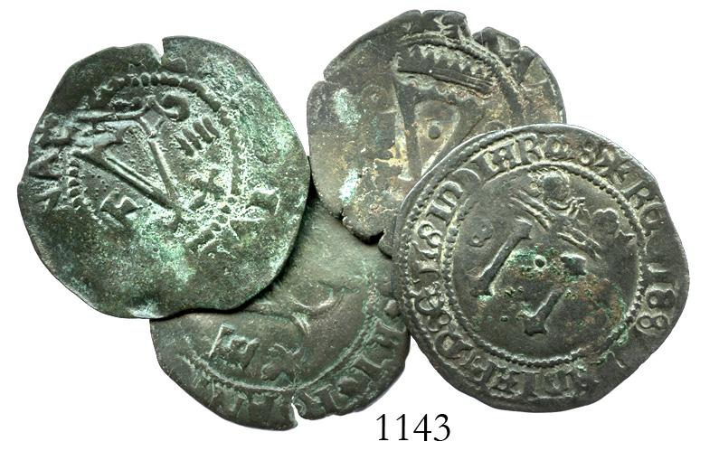 Lot of 4 Santo Domingo, Dominican Republic, copper 4 maravedis, Charles-Joanna, assayer F, nice specimens, one with early Gothic legends. 13.2 grams total. Interesting lot for study, as one shows an E-like assayer F, one shows mintmark P-S, and a third shows full Gothic legends, Fine or so on average, mostly dark and patinated.