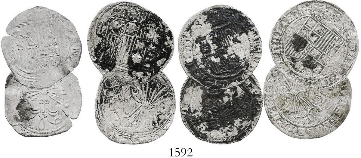 Lot of 4 Spanish Ferdinand-Isabel minors (one 2R and three 1R), various mints. 14.7 grams total. All corroded, clipped or damaged, with various amounts of cleaning and/or toning, Fine or better for actual wear.